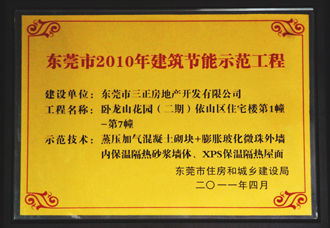 三正地產積極相應國家政策,在商品房物業的打造上,嚴把規劃設計與工程施工關,結合國家對房地產設計行業規劃、設計方面新的要求,推進建筑環保節能,并取得了不俗的成績。其中,三正臥龍山依山居1~7幢因采用蒸壓加氣混凝土砌塊+膨脹玻化微珠外墻、內保溫隔熱砂漿墻體、XPS保溫隔熱屋面等新型環保節能材料,被評為“東莞市2010年建筑節能示范工程”,獲得政府表彰與嘉獎。